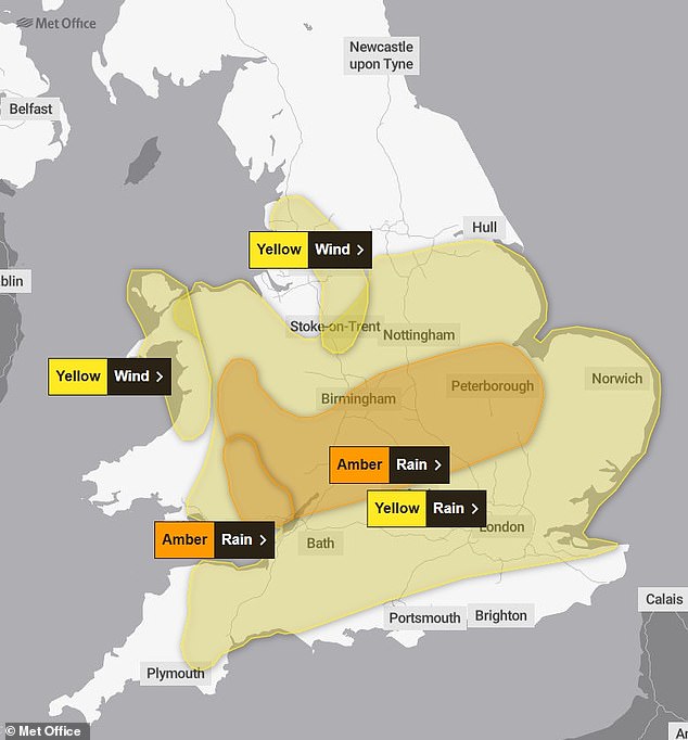 A broader and extended yellow rain alert was also put in place across much of southern England and the Midlands, effective from 6am tomorrow until 6am on Saturday.