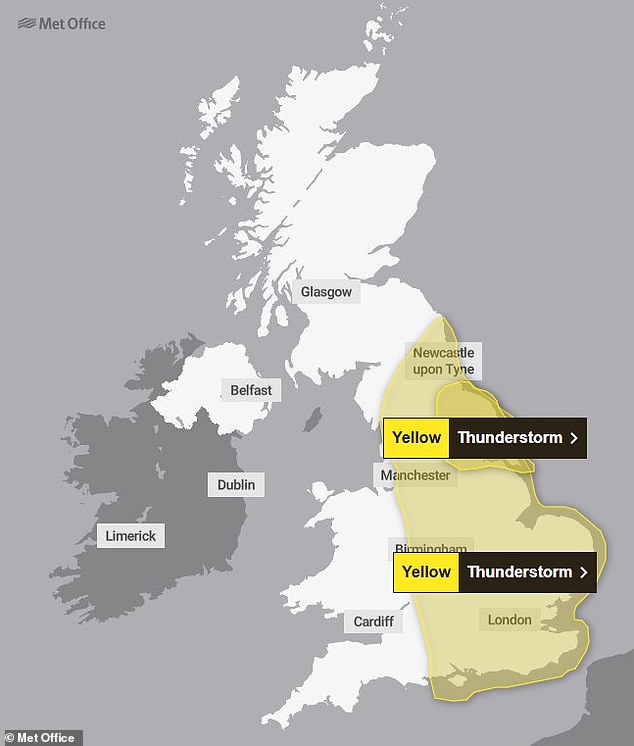 A yellow thunderstorm warning is in place for North East England from 12pm today until 8pm, and then for most of the rest of England from 9pm until 6pm tomorrow.