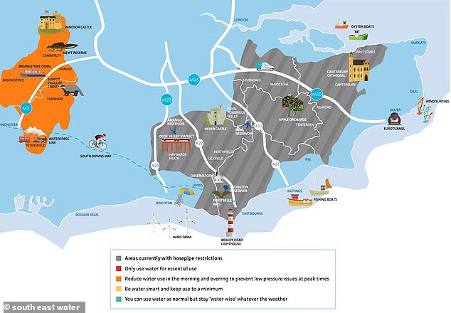 South East Water said in a statement last week: 'Demand for drinking water in Kent and Sussex has reached record levels since May – with the ongoing warm and dry weather, we're all using far more water than usual.